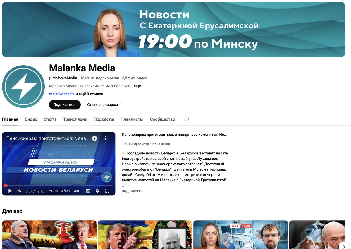 Malanka Media is a network of YouTube channels operated by journalists and technical staff based outside Belarus, in exile. It is consistently among the top five most popular YouTube news organisations targeting Belarusian audiences.